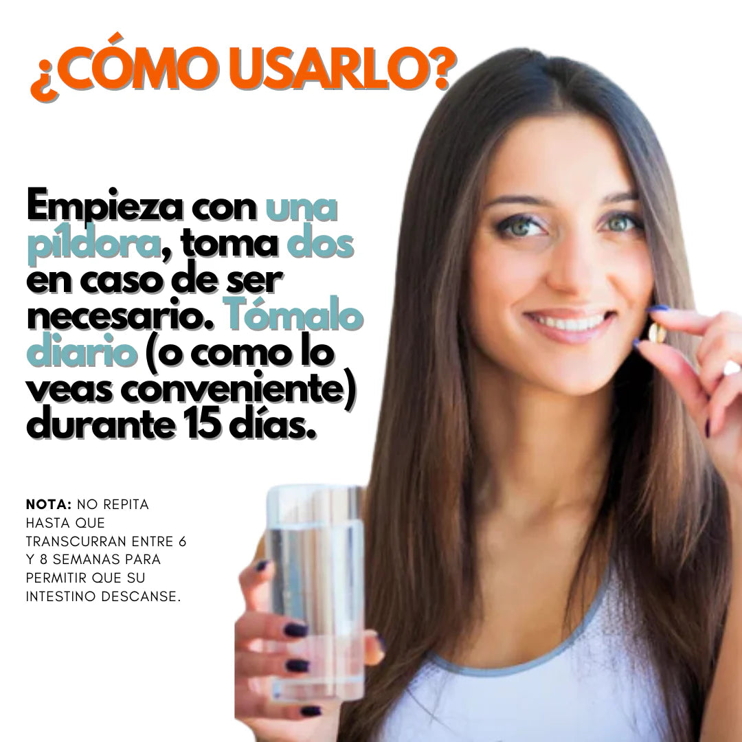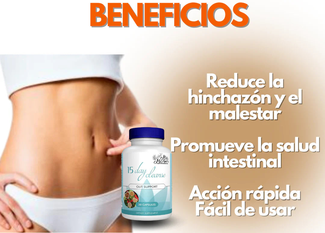 Cada frasco deClean15™contiene 60 cápsulas,un suministro para 30 días,con una dosis diaria de 3 cápsulas.Es ideal para quienes buscan un alivio rápido y duraderodel malestar digestivo, estreñimiento y acumulación intestinal.