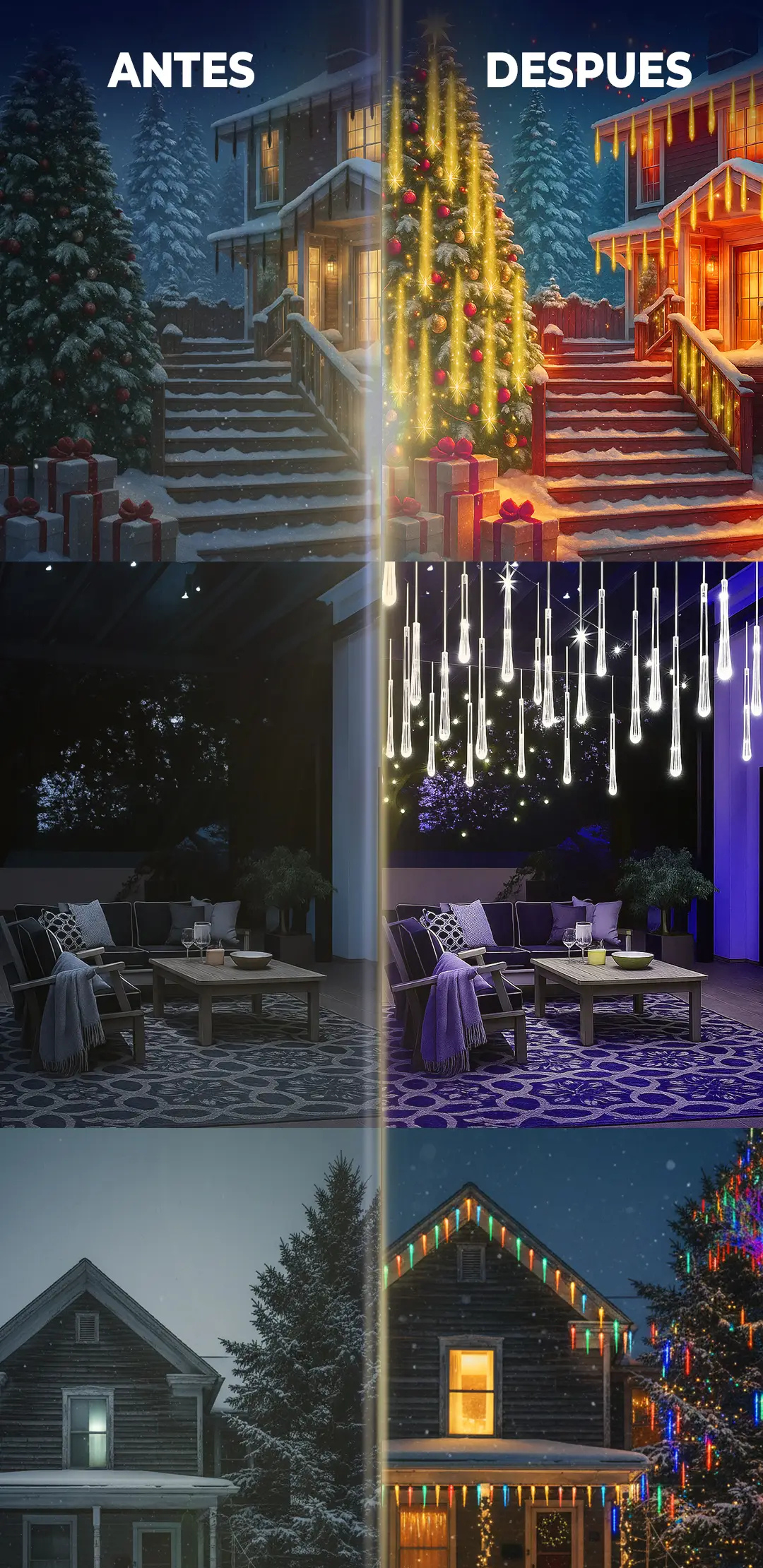 Convierte tu terraza, balcón o habitación en un rincón navideño lleno de encanto. Las Luces Meteorito crean una lluvia luminosa estilo nieve brillante que atrae miradas y despierta en ti esa emoción cálida que solo la Navidad puede traer.