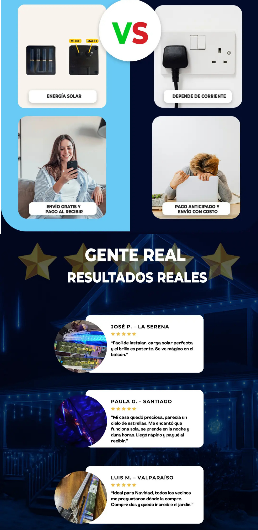 Sus luces LED con panel solar resistente al agua te permiten decorar exterior o interior como más te guste. Tú eliges dónde agregar ese brillo navideño que quieres ver, sin enchufes, sin cables y aprovechando la energía del sol.