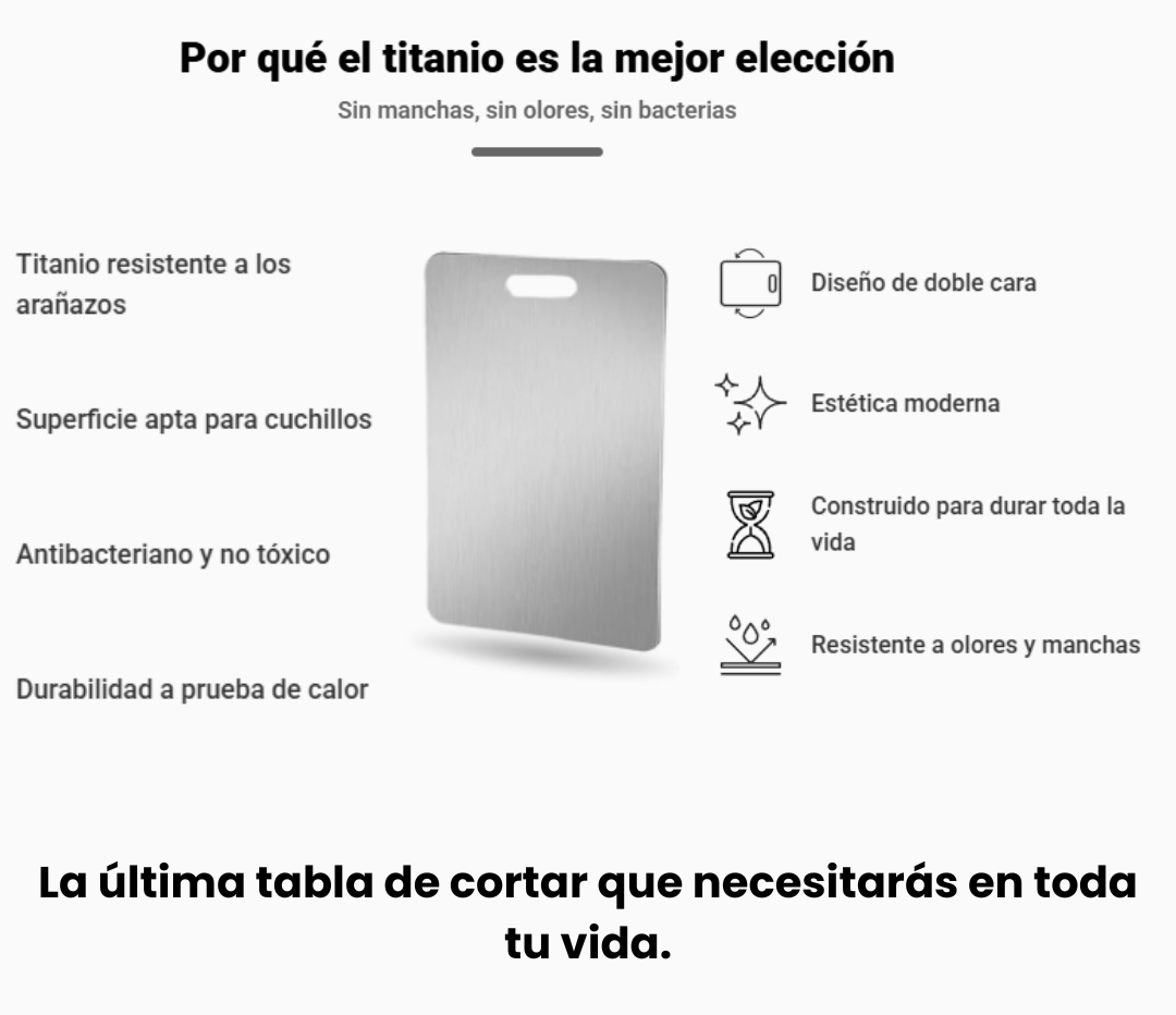 La tabla de titanio te entrega una higiene real, una resistencia incomparable y una limpieza instantánea que ninguna tabla de madera o plástico puede ofrecer. Cocinar ya no tiene por qué ser riesgoso ni frustrante: cambia a una tabla que dura para siempre, te mantiene seguro y transforma tu experiencia en la cocina desde el primer día.